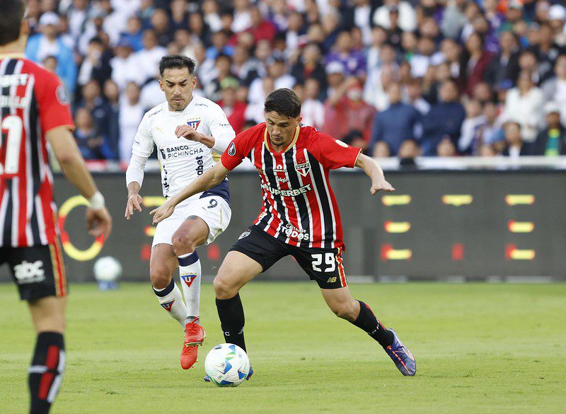 O São Paulo deixou o Estádio Casa Blanca, em Quito, no Equador, com uma desvantagem de 2 a 0 contra a LDU, após o duelo de ida das quartas de final da Libertadores, nesta quinta-feira (18). O Tricolor tem de vencer na volta por três gols de diferença para avançar ainda nos 90 minutos. Se triunfar por dois de frente, a disputa vai para os pênaltis.