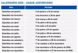 Conforme calendário divulgado pela Caixa Econômica Federal, o saque-aniversário fica disponível sempre a partir do 1º dia útil do mês em que o trabalhador completa mais um ano de vida. O prazo para sacar os valores é de dois meses. Ao optar pelo saque-aniversário, o trabalhador automaticamente deixa de ter direito à modalidade de saque-rescisão, na qual é possível sacar integralmente o saldo da conta de FGTS em caso de demissão sem justa causa.