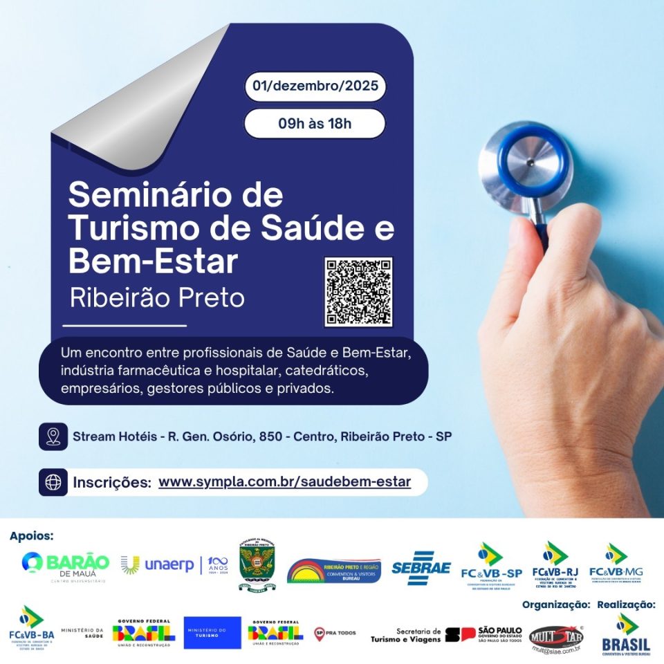 No dia 1º de dezembro, das 9h às 18h, será realizado o Seminário de Turismo de Saúde e Bem-Estar, cujo objetivo é reunir profissionais da saúde, gestores públicos e privados, representantes da indústria farmacêutica e empresários da área de saúde para discutir sobre bem-estar, turismo de saúde e a importância de Ribeirão Preto para o cenário nacional em saúde.