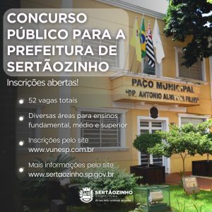 Mais informações sobre as vagas, provas e o edital completo do Concurso Público nº 001/2024 estão disponíveis no Diário Oficial, edição 1168, publicado em 30 de setembro de 2024, acessível pelo site www.sertaozinho.sp.gov.br, na seção “Imprensa Oficial”.