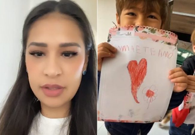 Depois, Simone mostrou os filhos com algumas cartinhas repletas de coração feitas pelos pequeninos. “Ah, coração…eu amo vocês tanto! Tem coisa melhor do que acordar com meus passarinhos?”, afirmou.