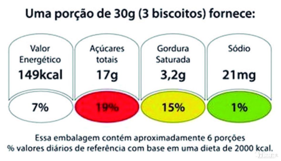 Pela proposta do Semáforo, os produtos deverão ter um rótulo frontal que indica, por porção, a quantidade de sódio, açúcares totais e gordura satu­rada, coloridos em verde, ama­relo e vermelho.