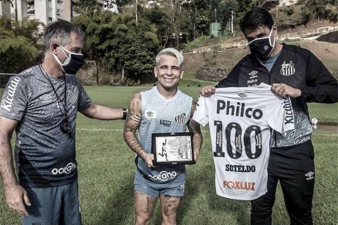 No Santos, para os jogadores que atingem a marca centenária de partidas disputadas pelo clube, já se tornou tradição receber uma placa e uma camisa com o número 100 autografada por Pelé. Não foi diferente para Soteldo, mas o palco da homenagem foi especial para o atacante.