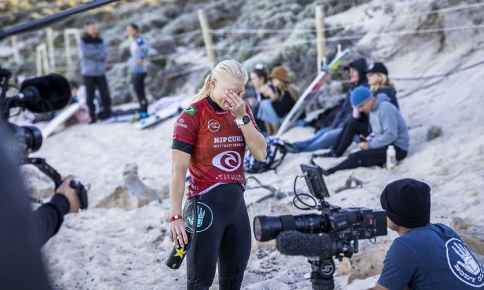 A gaúcha foi prejudicada demais pelo mar de Strickland Bay, que começou o dia com ondas baixas e longos intervalos entre as séries. Em condições tão adversas, a brasileira somou apenas 4,77 nas duas notas computadas, atrás das australianas Nikki Van Dijk, com 10,10, e Mia McCarthy, com 7,16.