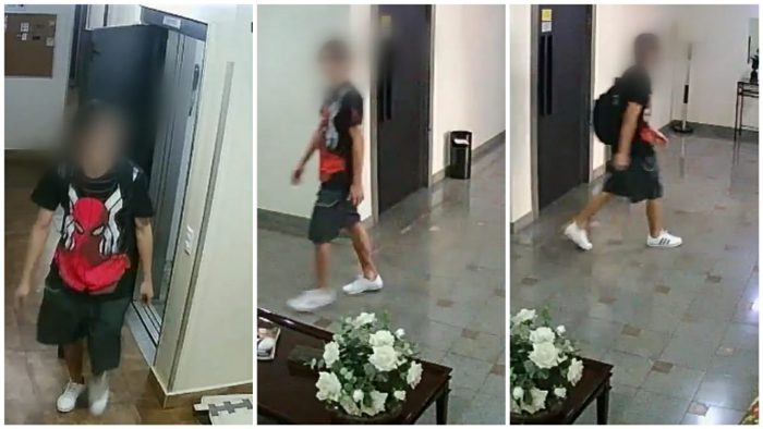 Depois do furto, o suspeito teria descido as escadas e acessado o elevador de serviço no oitavo andar, passando pela portaria com a mochila nas costas.