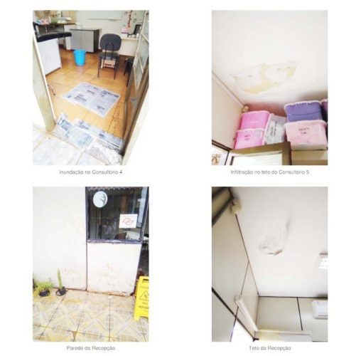 Problemas – Foi detectado que os ambientes externos e internos não estão em boas condições de conservação, segurança, organização, conforto e limpeza. Infiltração nas paredes, no teto da recepção e no teto de consultórios. Salas com goteiras ou inundadas pela chuva. Falta de cobertura para acesso aos consultórios 4 e 5 dificultando o acesso em dias de chuva.