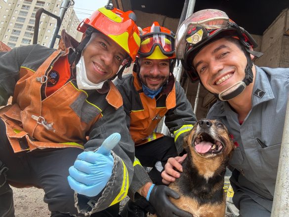 ocorrência e conseguiram resgatar um cachorro que tinha ficado preso nos escombros. O animal, já seguro e fora de perigo, voltou para agradecer os socorristas.