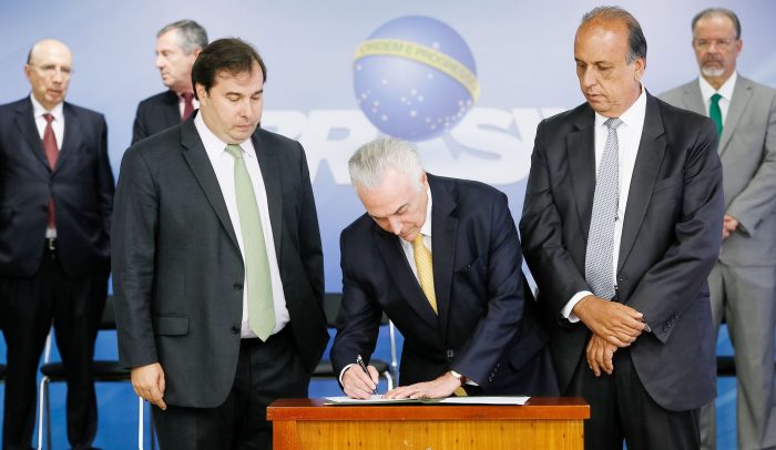 O presidente Michel Temer assinou nesta sexta-feira, 16, o decreto para a intervenção fede­ral na segurança pública do Es­tado do Rio de Janeiro e fez um discurso em tom de declaração de guerra ao crime organizado. O governador do Estado, Luiz Fernando Pezão, e o presidente da Câmara dos Deputados, Ro­drigo Maia (DEM-RJ), também participaram da cerimônia.