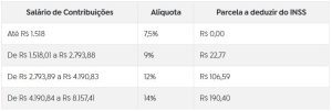 A correção de 4,77% também incidirá sobre a tabela do INSS, por meio da qual os trabalhadores da iniciativa privada com carteira assinada e de empresas estatais recolhem as contribuições mensais à Previdência Social. As alíquotas e as faixas de dedução vão incidir sobre as seguintes faixas: