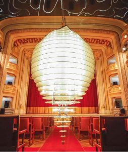 No formato de uma gota d’água, a obra-prima de Tomie Ohtake pesa quase uma tonelada e meia e remete ao incêndio, assim como o desenho do teto (uma alusão às labaredas que lamberam o teto original), que também foi projetado pela artista, que na ocasião da restauração escalou andaimes para fazer os desenhos a lápis na base de gesso que antecedeu a versão definitiva.