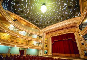 Na década de 1980, o Pedro II foi destruído por um incêndio: o ferro retorcido no teto do teatro representa as chamas, segundo a artista Tomie Ohtake