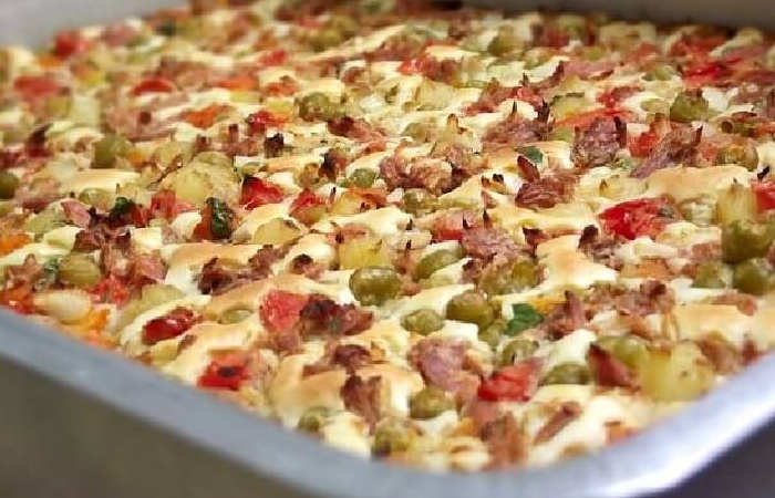 3. Espalhe o recheio por cima da massa e leve para assar em forno pré-aquecido (200°C) por uns 40 minutos.