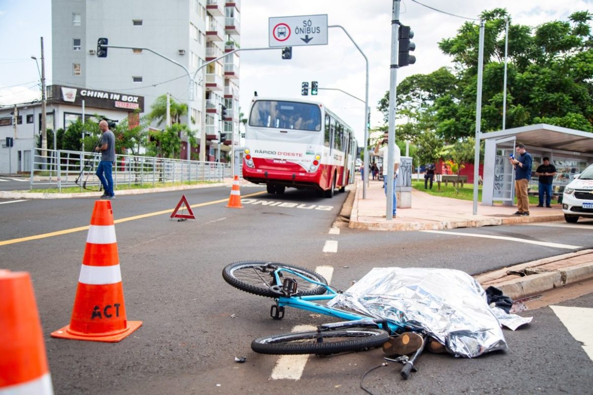 Um ciclista de 53 anos foi atropelado por um ônibus intermunicipal. O ciclista bateu na lateral do ônibus e caiu, sendo atropelado em seguida. O homem morreu antes que pudesse ser socorrido.