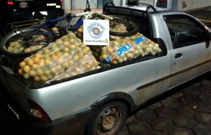 Os policias foram acionados para atender denúncia de furto das frutas e quando chegaram ao local, encontraram um Fiat Strada com 18 sacos de laranjas de 50 quilos cada um.