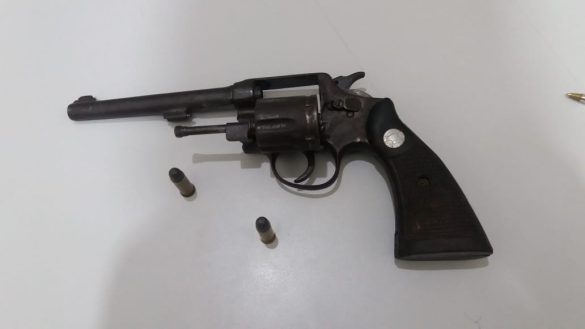 Um revólver calibre 32 com duas munições intactas foi apreendido com os assaltantes, de 24 e 22 anos, e um menor (17), que foram presos em flagrante ao serem retirados da cabine da VW Amarock.