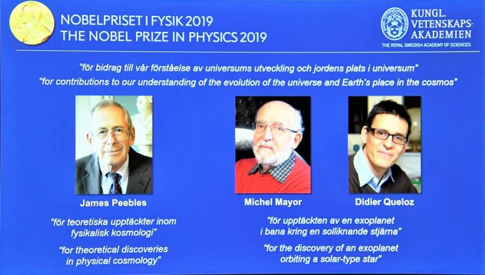 Os pesquisadores James Peebles, nascido no Canadá e naturalizado americano, Michel Mayor e Didier Queloz, ambos da Suíça, foram laureados na terça-feira (8) com o Prêmio Nobel de Física 2019 por suas contribuições para o entendimento da evolução do Universo e do lugar que a Terra ocupa no Cosmos.