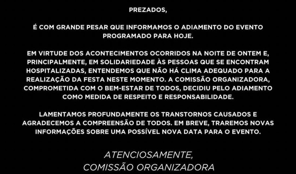 Após o ocorrido, os organizadores da “Festa dos 100 dias” anunciaram o adiamento do evento. Em comunicado divulgado nas redes sociais, eles afirmaram que a decisão foi tomada “em respeito aos envolvidos e em razão da gravidade do episódio”.