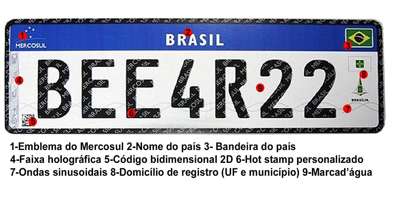 Revestidas com película retrorrefletiva, as novas placas terão fundo branco com margem superior azul e as imagens da bandeira brasileira e o símbolo do Mercosul, mantendo os atuais sete caracteres alfanuméricos. Na parte frontal, a película protetora deverá conter as palavras Mercorsur Brasil Mercosul estampadas. Além disso, deverão possuir código de barras bidimensionais dinâmicos (Quick Response Code – QRCode) contendo números de série e acesso às informações do banco de dados de seu fabricante.