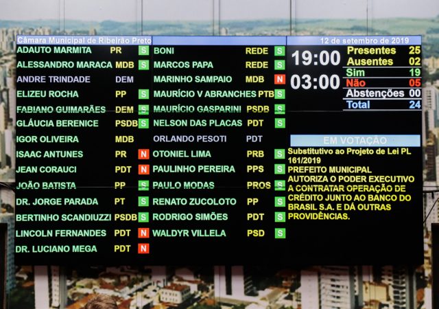 A Câmara de Vereadores aprovou nesta quinta-feira, 12 de setembro, por 19 votos a favor, cinco contra e duas ausências, o projeto de lei em que autoriza o Executivo a contratar um novo financiamento junto ao Banco do Brasil, no valor de R$ 75,45 milhões. O objetivo é viabilizar serviços nas áreas de cultura, obras públicas e educação, entre outras. Votaram contra o presidente do Legislativo, Lincoln Fernandes (PDT), Jean Corauci (PDT), Luciano Mega (PDT), Marinho Sampaiuo (MDB) e Isaac Antunes (PR).