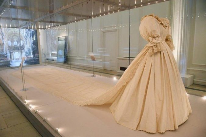 A peça criada pelos estilistas Elizabeth e David Emmanuel foi cedida pelos príncipes William e Harry, filhos de Lady Di, à mostra Royal Style in the Making. A veste ficou conhecida por ter a maior cauda da realeza, cerca de oito metros.