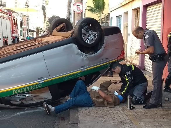 Um VW Gol teria atingido a lateral do táxi e provocado o capotamento. Há sinalização semafórica no local.