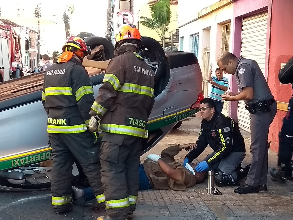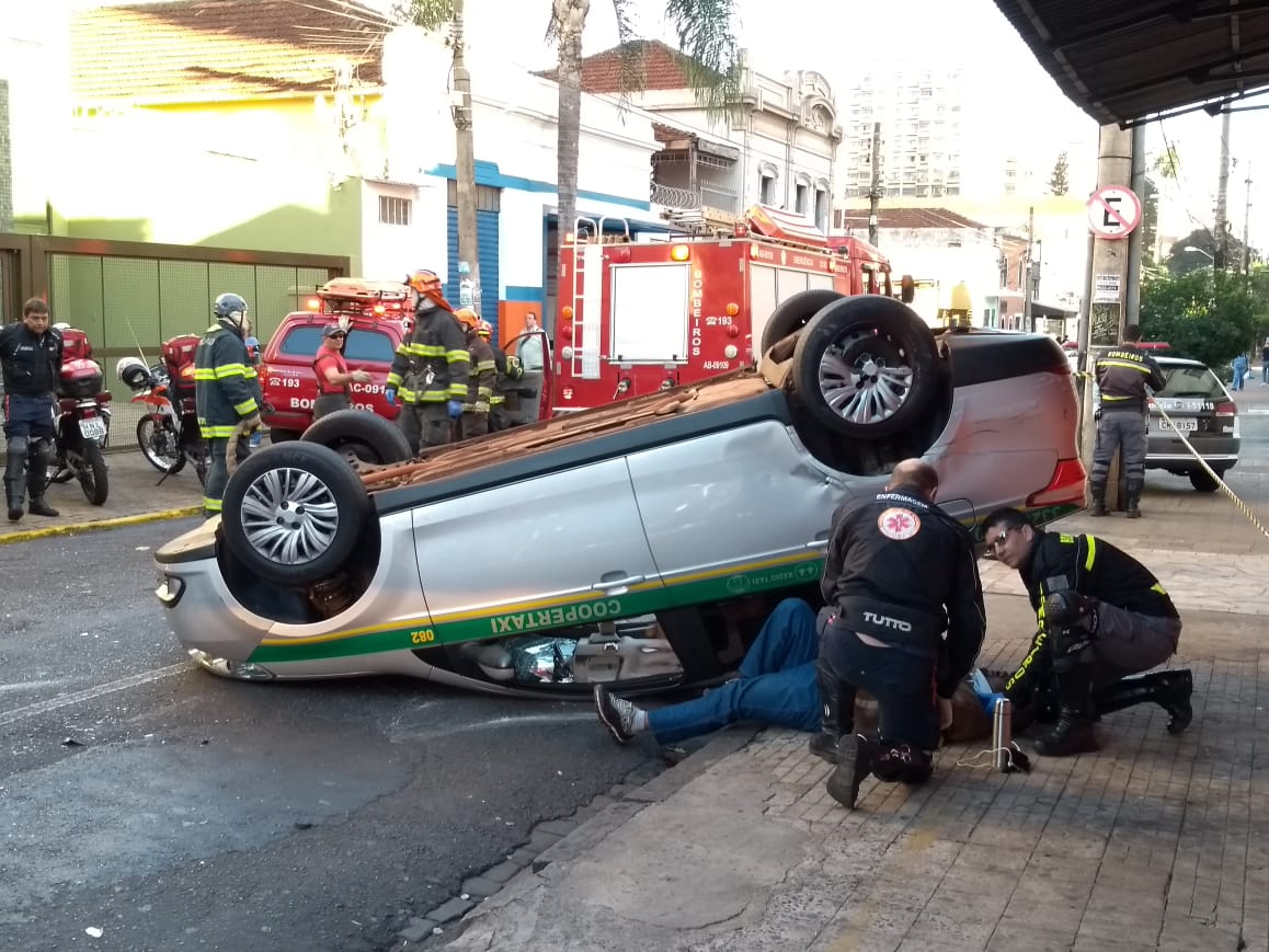Um VW Gol teria atingido a lateral do táxi e provocado o capotamento. Há sinalização semafórica no local.