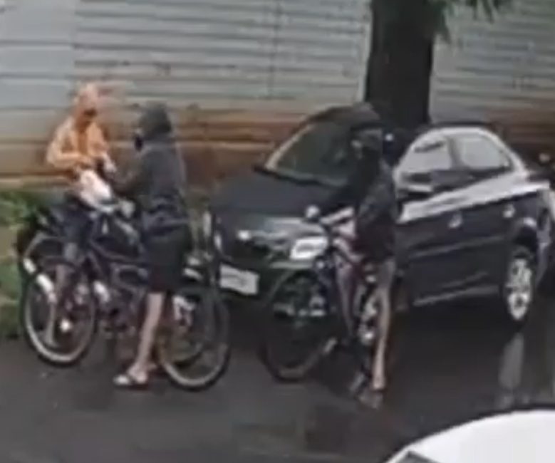 Três homens chegam em duas bicicletas em plena luz do dia. Eles usavam moletons e um dos ciclistas trazia um capacete branco. Um dos homens vai até uma motocicleta e começa a forçar a trava.