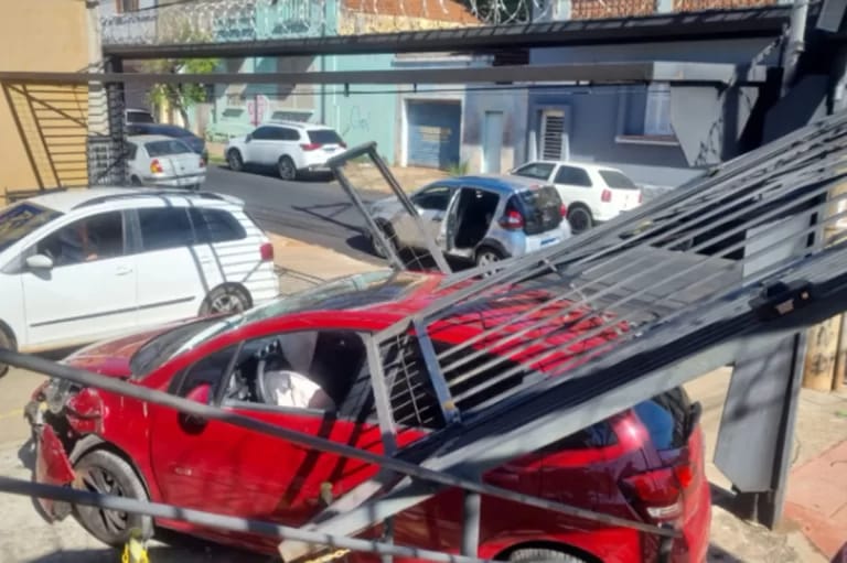 Um carro invadiu o estacionamento de uma loja de equipamentos de segurança após se envolver em um acidente, na manhã desta quinta-feira (22), no bairro Campos Elíseos, zona Norte de Ribeirão Preto.