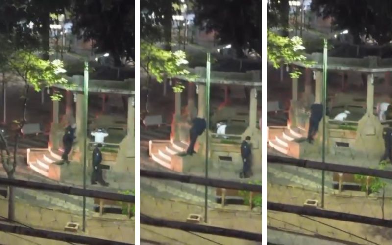 As imagens mostram dois homens no coreto da Praça XV de Novembro, Centro de São José do Rio Pardo, distante 140 km de Ribeirão Preto, na região de Casa Branca. Dois agentes da GCM se aproximam e um deles agride um dos homens com golpes de cassetete.