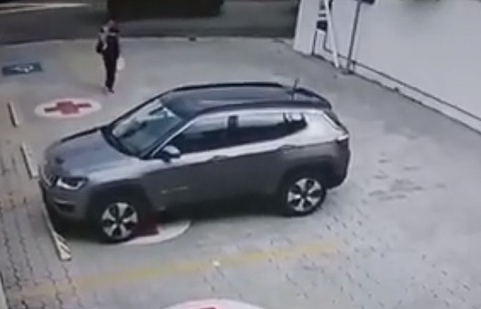 A criança entra no banco traseiro e a motorista é abordada pelo casal de criminosos neste momento. É possível notar, um pouco antes, os assaltantes passando pela calçada e observando as vítimas.