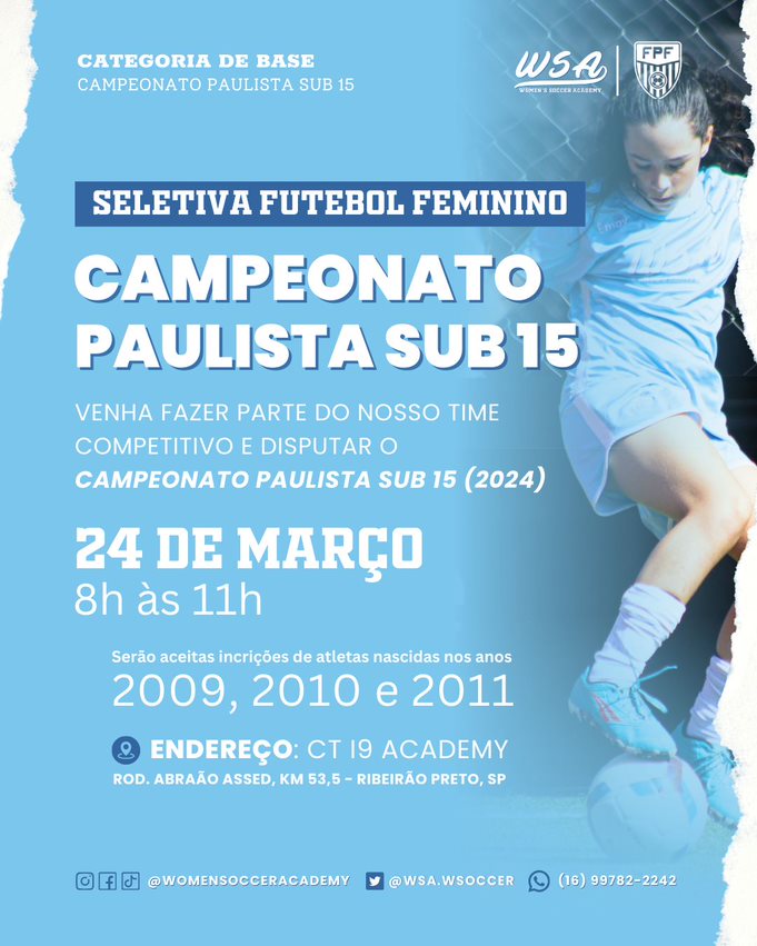A WSA, Women´s Soccer Academy, primeira escola dedicada somente para mulheres de Ribeirão Preto, vai realizar um processo seletivo em busca de novos talentos para a categoria sub-15.